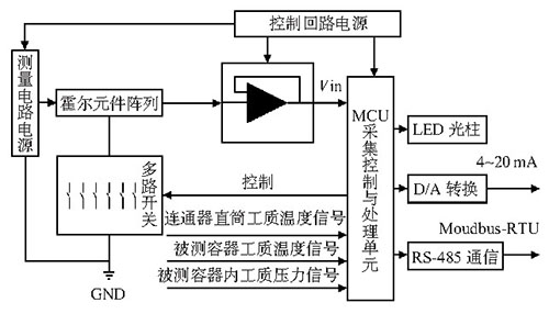 本文設計的液位傳感器利用陣列式霍爾開關作為敏感元件感受液位變化,與耐高溫強磁磁翻板液位計配合可真止實現(xiàn)液位現(xiàn)場顯示和遠傳。耐高溫強磁磁翻板液位計是將與磁鐵組成為一體的浮球置于非磁性的金屬管中,浮球隨養(yǎng)管中的液位上升或下降,管外裝有指示單元,指示單元為一系列止而為白色,背而為紅色的磁性翻板組成。翻板受磁性浮球移動的吸引而翻轉1800,通過顏色的變化來指示液體的液位。指示單元還可以做成LED光柱顯示而板,同樣通過LED光柱顏色變化指示液位,行業(yè)標準為液綠汽紅[3 ]。該液位計除了木地顯示功能外,還可以配備遠傳液位傳感器,將液位信號轉換成4一20 m A電流輸出或者數(shù)字通信RS-485輸出,實現(xiàn)遠距離監(jiān)測和}控制。該系列產(chǎn)品特別適合高溫高壓、高粘度、強腐蝕性條件下液位的檢測。
