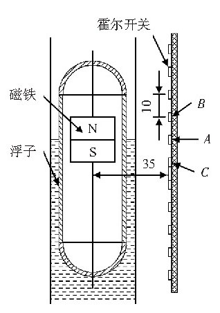 算出磁性浮子的磁場分布,根據(jù)測量精確度、霍爾開關的磁場強度閡值、霍爾開關到浮子的距離等己知條件計算出浮子內(nèi)磁鐵的大小,簡化了工藝流程,減少了工作量。在程序設計時,