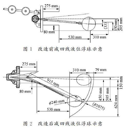 針對減四線液位測量進行大轉(zhuǎn)角、切割集油箱改造,有效量程大于設(shè)計量程的80%,其改造測繪圖如圖2所示。改造后,安裝支架120 mm,插入深度為1?。保担担恚恚瑢嶋H測量液位達450mm,儀表接液部位全部選用317材質(zhì)。轉(zhuǎn)軸—杠桿套筒、杠桿套筒—連桿、浮球—連桿的固定連接節(jié)點及加工焊接坡口增加焊接強度;對于活動節(jié)點,采用專用銷子固定。