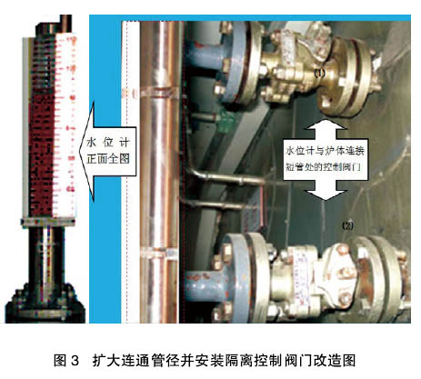 將水位計(jì)與爐體之間連通管山原來(lái)的ch16mm更換為ch20mm的管段,并安裝兩個(gè)控制閥門,通過(guò)關(guān)閉閥門(1)和(2),實(shí)現(xiàn)水位計(jì)與爐體隔離(l圖3)。這樣,拆卸水位計(jì)時(shí)既小需要排低爐水,也避免了對(duì)加熱爐真空度的影響。