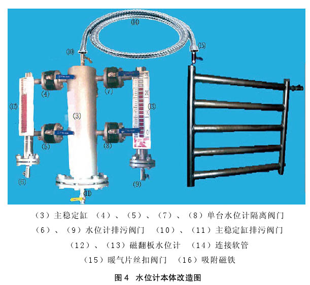 結(jié)介加熱爐水位計(jì)實(shí)際運(yùn)行研究,通過(guò)安裝磁鐵、安裝隔離控制閥門、擴(kuò)大穩(wěn)定缸容積、加裝雙水位、連接沖洗排污管線等一系列改造,將加熱爐四氟磁翻板液位計(jì)逐步改進(jìn),實(shí)現(xiàn)設(shè)備平穩(wěn)運(yùn)行。