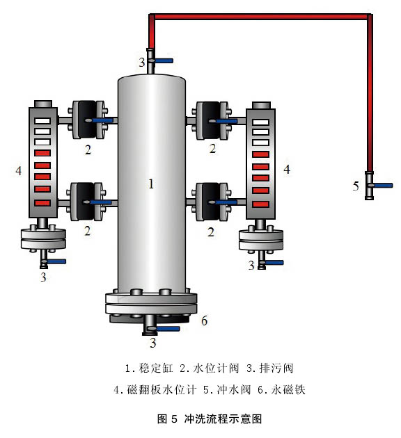 (2)拆下永磁鐵關(guān)閉4個(gè)水位計(jì)閥,打開(kāi)穩(wěn)定缸上、下閥及閥門5,單獨(dú)沖洗主穩(wěn)定缸。
