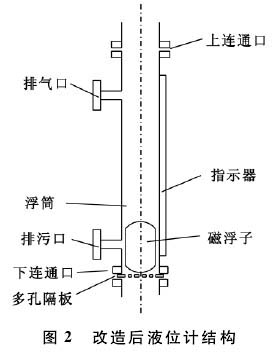 (3)方案3。改造現(xiàn)有的液位計(jì),采用上下端日連接,上過(guò)程進(jìn)日改為排氣口,下過(guò)程進(jìn)日改為排污口,原安裝浮子法鑄和排氣閥接日改為連通日,在下部增加一個(gè)多孔隔板,保證浮子不進(jìn)人工藝管線,同時(shí)保證液體的正常流動(dòng)。在保證不改變液位計(jì)結(jié)構(gòu)情況下,將液位計(jì)與工藝管線連接。此方案優(yōu)點(diǎn)是花費(fèi)少,不閑置設(shè)備,并且還能達(dá)到液位計(jì)與管線清理同步,實(shí)現(xiàn)維修與檢修同步。