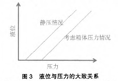 針對設(shè)備的故障,技術(shù)人員采取了更換多種質(zhì)量好的磁感應(yīng)開關(guān)(如耐高溫型等),以及基于磁翻板的外貼式模擬量液位控制,但效果均不理想。其他液位測量(如超聲波等)造價較高,而且需要對設(shè)備進(jìn)行相應(yīng)的改造,并且停運(yùn)一段時間,而該系統(tǒng)屬于公用,上述條件均無法滿足。既要實現(xiàn)自動控制,又要相應(yīng)允許實施。技術(shù)人員再次結(jié)合系統(tǒng)圖進(jìn)行了分析:該水位溢流處和下限處范圍還是比較寬裕,而且箱體為非承壓容器,所以箱體內(nèi)的壓力和大氣壓相差不大,即便是有也基本上保持恒定,結(jié)合原水位測量的結(jié)構(gòu),考慮在帶報警開關(guān)磁翻板液位計的液位測量筒下部加裝1臺壓力變送器,在箱體壓力不是很大且基本恒定的情況下,液位與壓力值基本成對應(yīng)關(guān)系(只是在現(xiàn)場修正疊加一個常數(shù)值來消除箱體上不恒壓所帶來的偏差)。液位與壓力的關(guān)系曲線見圖3。
