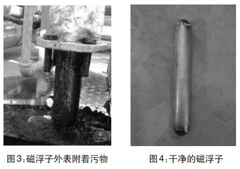 經(jīng)過兩年多運(yùn)行,污水罐內(nèi)可能沉淀污泥雜質(zhì)導(dǎo)致液位計(jì)示數(shù)不準(zhǔn)。現(xiàn)場拆卸液位計(jì),并且對浮球和磁浮子進(jìn)行清洗。(圖3-圖4)