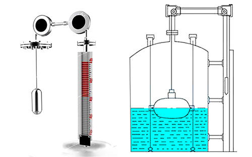 帶報警開關磁翻板液位計是一種機械式的液位測量機構,根據(jù)力平衡原理設計,具體為阿基米德的浮力原理和牛頓的重力原理,在測量容器中的液位處于某一位置時浮標重量W,重錘指針重量W1 和浮標浸在液體中所受浮力F,整個系統(tǒng)中摩擦力f,四力處于平衡狀態(tài)(即W-F- W1-f=0)。當液位上升時,由于牽引索吊著浮子沿導向索被浮起,液體浮力,F(xiàn)增大,使原平衡系統(tǒng)地四力失去平衡,在重力的作用下,重錘指針向下滑行,同時也連續(xù)地在標尺上指示液位的上升高度。同理,可說明液位下降時,浮子浮力F減少,使牽引索與液體同步下降,由于浮子的重量大于重錘指針的重量,使指針向上運動,同樣在液位連續(xù)下降變化時,重錘指針能隨之連續(xù)地指示液位的下降情況,從而達到準確測量液位變化的目的。