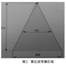 我公司有6臺硫酸儲罐,罐體間可實現(xiàn)連通,為保證測量的精度和安全性,我公司分別在6個罐體上分別安裝了雷達液位計,互為備用,并且在正常情況下還可以實現(xiàn)兩個液位測量值的準確度參照比較。在安裝雷達波液位計時,剛開始采用傾斜的安裝方式,其傾斜角度不超過15°,調(diào)試液位計儀表時發(fā)現(xiàn)無物位數(shù)據(jù)顯示,分析故障原因是由于發(fā)射的雷達波到達罐體鋼板上反射回來的,其主要原因是產(chǎn)生的虛假回波干擾太大造成的。重新調(diào)整雷達液位計的安裝角度后發(fā)現(xiàn)出現(xiàn)物位數(shù)據(jù),但該數(shù)據(jù)波動很大,并且由于分析原因可能是因為液面波動對雷達波反射造成影響,基于此原因,決定在罐內(nèi)的測量筒內(nèi)安裝反射板,重新調(diào)整雷達物位計的安裝,使其雷達波的發(fā)射天線平面與反射板平行,這樣測得的物位數(shù)據(jù)比較準確。反射板的面積計算:采用FMR530智能型雷達液位計,其天線尺寸參數(shù)DN80/3",波束角α=10°,雷達波傳播的區(qū)域如圖2 所示。根據(jù)公式Tan5°=W/2D,可求出W=900 mm,進而求出反射板的面積。因此我們可以制作一個直徑不小于900 mm的圓盤即可。