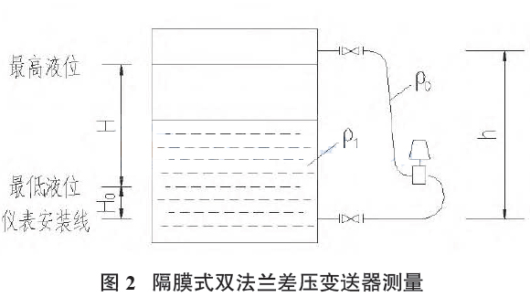 圖1中,P 1為介質(zhì)密度,H。為液位起始點。差壓變送器與液體導管為水平安裝,只要確定氣相管內(nèi)無冷凝液,當液位密度穩(wěn)定時,即可準確測量液體的高度。但在液氨儲罐的液位測量過程中,氣相管內(nèi)的氣氨會隨環(huán)境瘟度的變化而冷凝,產(chǎn)生壓差,故這種接管式的差壓測量方法不適用于液氮儲罐的測量。