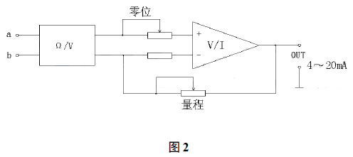 來(lái)自液位傳感器的對(duì)應(yīng)液位高度的電阻信號(hào),進(jìn)入圖2所示的a,b端,經(jīng)處理后*終輸出4~20mA DC標(biāo)準(zhǔn)信號(hào)。