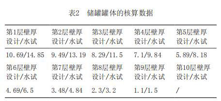 根據(jù)GB50341-2014《立式圓筒形鋼制焊接油罐設(shè)計(jì)規(guī)范》中的規(guī)定,儲(chǔ)罐內(nèi)徑小于60m,采取的是定設(shè)計(jì)點(diǎn)發(fā)進(jìn)行核算[3],核算出的儲(chǔ)罐的每層罐壁的所需厚度(mm)(設(shè)計(jì)與試水條件下)見(jiàn)表2。