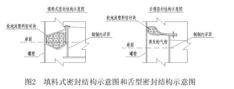 鋼制內(nèi)浮頂與罐壁之間的密封通常采用彈性材料密封結(jié)構(gòu),根據(jù)彈性密封件的結(jié)構(gòu)和斷面尺寸,密封的結(jié)構(gòu)形式主要可以分為填料式密封和舌型密封結(jié)構(gòu)兩大類(lèi)。兩者的密封結(jié)構(gòu)示意見(jiàn)圖2:
