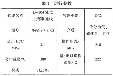 該裝置于2016年9月開工轉(zhuǎn)人正常運行,2016年9月7日發(fā)現(xiàn)D-104液面計上引出線有冒油氣現(xiàn)象,現(xiàn)場檢查發(fā)現(xiàn)D-104液面計上接管引出線法蘭后焊縫靠上部有裂紋現(xiàn)象,車間對泄漏部位進(jìn)行帶壓鉚擊消漏處理。9月8日該部位再次出現(xiàn)泄漏,裝置停工隔離處理(表1)。