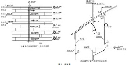 以昆侖能源華油天然氣四川廣安液化天然氣2萬方儲罐為例,在安裝多點溫度計過程中,內(nèi)罐底部溫度熱電阻需要從內(nèi)罐浮頂進入罐內(nèi),沿罐壁垂直向下固定在罐底部。如需夾層底部溫度測量,則需要將溫度熱電阻沿外罐壁垂直而下,固定在罐底夾層的氮氣管上,每間隔4m布置1個電纜固線器,如圖1所示。