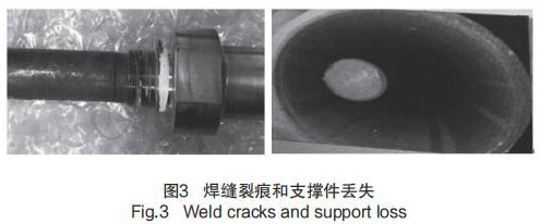 在歷次大修執(zhí)行 GSS 系統(tǒng) MSR 食用油液位計預防性維修檢查時發(fā)現,部分導波桿支撐件破碎并丟失,同時存在探桿根部焊縫有裂痕的問題,見圖 3 焊縫裂痕和支撐件丟失。