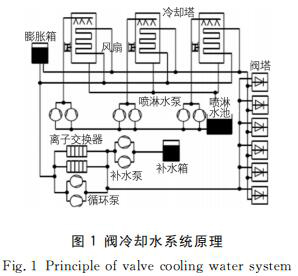閥冷卻水系統(tǒng)主要構成部分為閥內冷水系統(tǒng)與閥外冷水系統(tǒng)。閥內冷水系統(tǒng)主要通過內冷水與閥組件直接接觸流動,將防爆型磁翻板液位計中熱量帶出,確保防爆型磁翻板液位計組件中晶閘管、水冷電阻、陽*電抗器等發(fā)熱元件運行溫度具有可控性。而閥外冷水系統(tǒng)主要通過閉式冷卻塔或風機將內冷水中熱量帶走,并排放至環(huán)境中。防爆型磁翻板液位計內、外冷水系統(tǒng)的協同運行,可以使防爆型磁翻板液位計組件內部冷卻持續(xù)進行,并滿足元器件結溫要求,進而保證系統(tǒng)整體運行穩(wěn)定性、安全性。閥冷卻水系統(tǒng)原理如圖1所示。