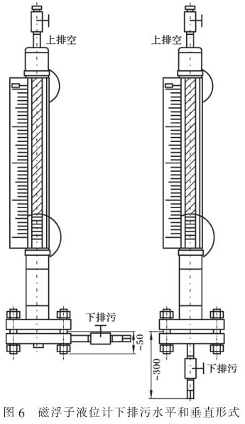 以常用防腐磁翻柱液位計(jì)為例。 此類(lèi)液位計(jì)安裝時(shí),一般選用側(cè)-側(cè)連接方式,帶放空和排污。因此, 應(yīng)根據(jù)預(yù)留空間, 決定放空或排污采用垂直(常用)或水平的安裝形式,如圖 6 所示。