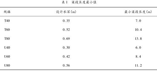 根據(jù)《灌溉渠道系統(tǒng)量水規(guī)范》(GB/T 21303 -2007),設(shè)置標(biāo)準(zhǔn)斷面的渠段長度,應(yīng)大于 20 倍*大水深。定型斷面量水渠槽的渠段長度如表 1 所示。