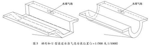 為便于直接確定渠道比降,定型斷面在工廠制作時(shí),在渠道堤頂安裝水準(zhǔn)氣泡,當(dāng)水準(zhǔn)氣泡居中時(shí),設(shè)定的定型渠道斷面比降即為 1/500 或 1/1000時(shí),不需再進(jìn)行渠槽斷面參數(shù)的現(xiàn)場率定,通過量測定型斷面渠道水深,即可求得過水流量。圖 5 為設(shè)置水準(zhǔn)氣泡的梯形渠道定型斷面和 U 型渠道定型斷面示意圖。