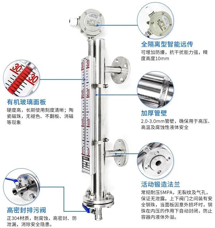 磁翻柱液位計(jì)是根據(jù)連通器和帶磁藕合基本原理而工作中的。做為一種普遍的液位儀檢測儀表,被普遍用于石油化工設(shè)備、倉儲物流運(yùn)送等制造行業(yè)對各種各樣儲槽、儲罐、球形器皿和加熱爐等機(jī)器設(shè)備內(nèi)的物質(zhì)開展液位儀檢驗(yàn)。相關(guān)磁翻柱液位計(jì)的基本原理,大家都廣為人知,但對其構(gòu)造和特性卻了解很少。那麼,磁翻柱液位計(jì)的構(gòu)造構(gòu)成和特性有什么呢?