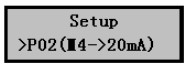 1)在污水液位計(jì)正常工作時(shí)按擊Mode鍵進(jìn)入?yún)?shù)設(shè)置菜單后按擊▼鍵選擇P02(4~20mA)設(shè)置菜單,如右圖。