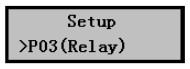 1) 在污水液位計(jì)正常工作時(shí)按擊Mode鍵進(jìn)入?yún)?shù)設(shè)置菜單后按擊▼鍵選擇到P03(Relay)繼電器設(shè)置菜單,如右圖所示。