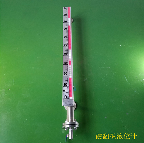 磁翻板液位計(jì)的結(jié)構(gòu)原理如圖,本體是一根連通管體,通過法蘭與用戶容器連接,連通管體內(nèi)有一磁性浮子,隨著液位的升降而升降。管體外面固定由翻柱組成的指示器,翻柱由紅白兩色組成,液拉未上升前為白色,當(dāng)液位上升磁性浮子跟隨上升,并通過磁耦合帶動(dòng)翻柱轉(zhuǎn)動(dòng)180度,翻成紅成紅色來指示液位,紅、白界位即容器內(nèi)的液位高度。